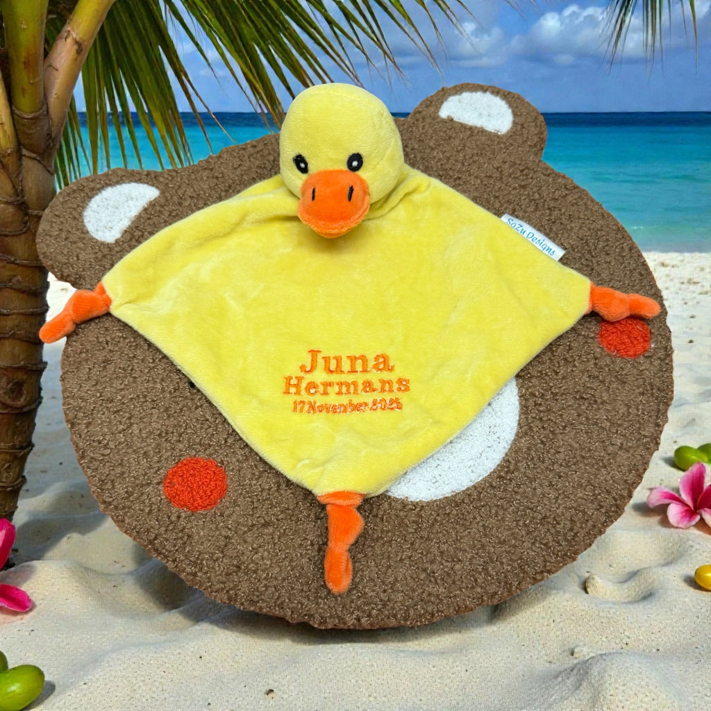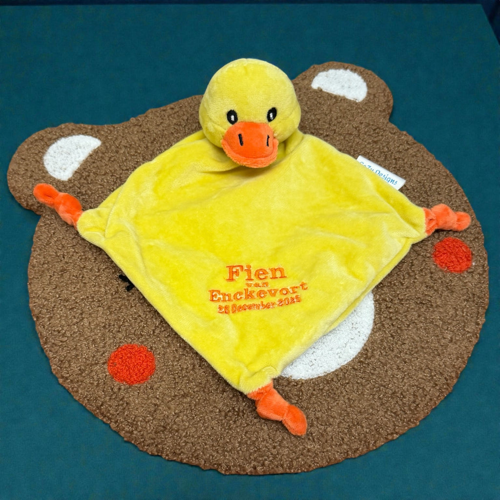 Vrolijk knuffeldoekje met eendje – een perfect gepersonaliseerd kraamcadeau