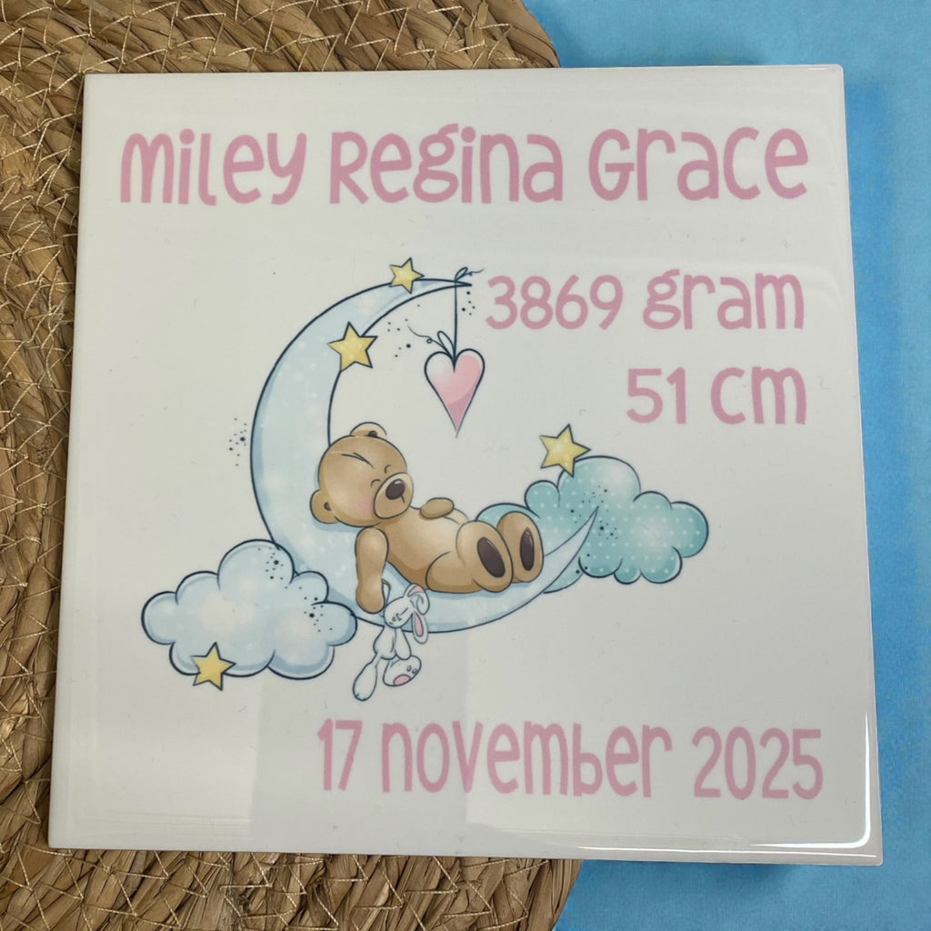 Is er een baby geboren? Verras de kersverse ouders met een gepersonaliseerd geboortetegeltje voor hun zoon of dochter! Dit prachtige kraamcadeau wordt bedrukt met een schattig beertje liggend op de maan en voorzien van de geboortedetails van de baby.