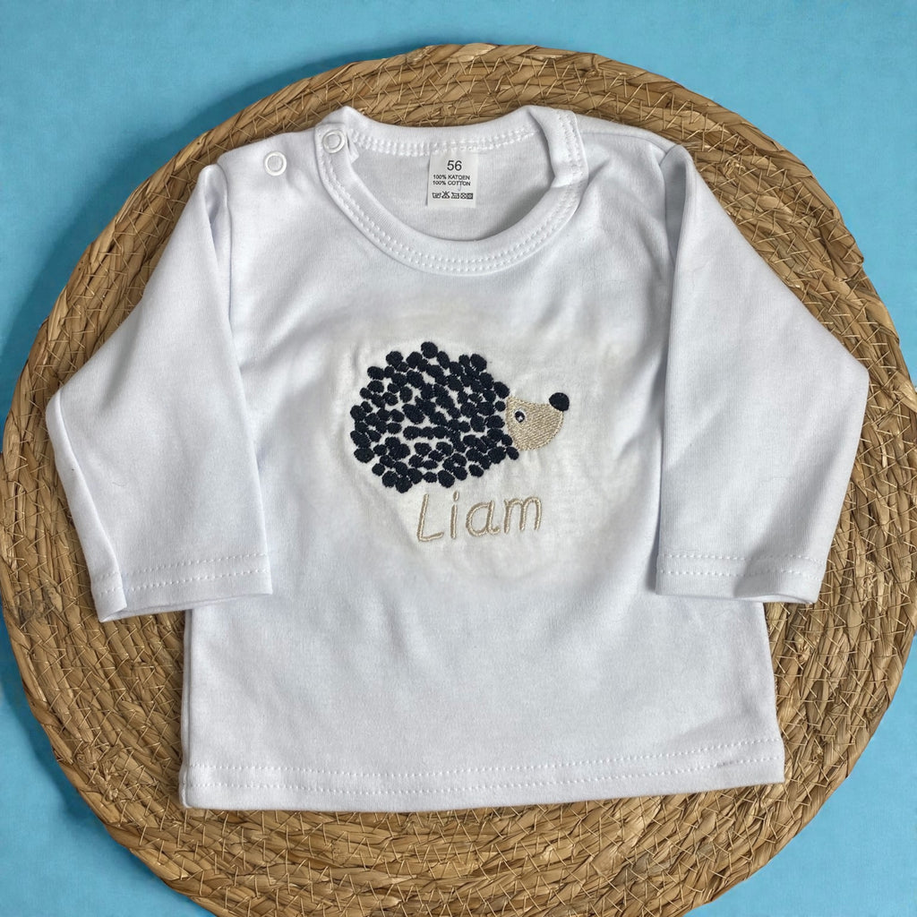 Gepersonaliseerd wit babyshirt met geborduurde egel en naam 100% katoenen lange of korte mouw met drukknoopjes.